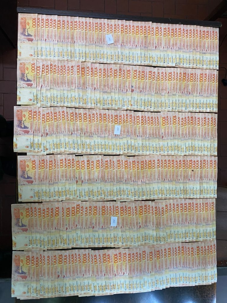 En presencia de testigos hábiles, se procedió a la apertura de mencionada bolsa, constatando en su interior la suma total de cuatro millones trecientos mil pesos sin documentación que avale su legal tenencia o transporte.