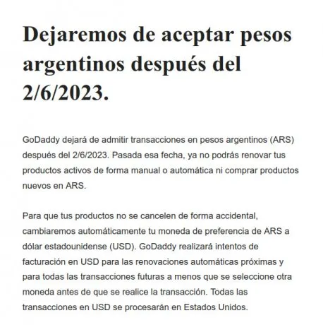 En el mail enviado a quienes utilizan el servicio, GoDaddy explicó que "dejará de admitir transacciones en pesos argentinos (ARS) después del 6/2/2023". Pasada esa fecha los clientes "no podrán renovar sus productos activos de forma manual o automática ni comprar productos nuevos en pesos argentinos".