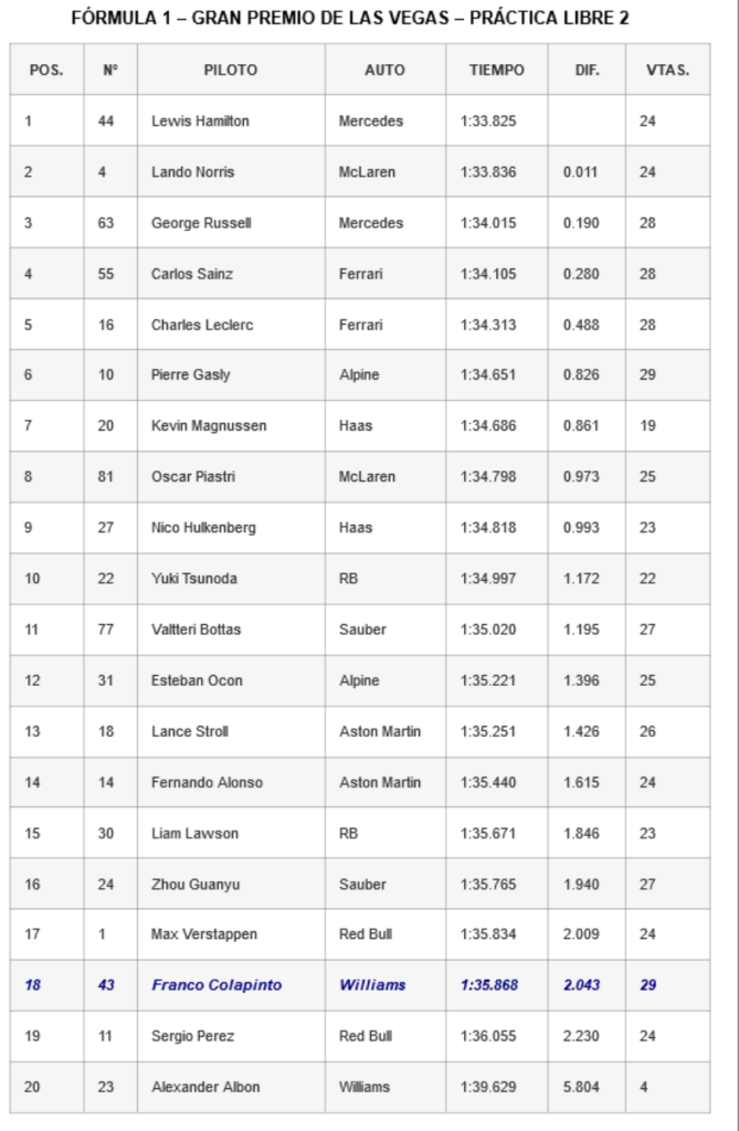 Con respecto al líder del campeonato Max Verstappen, tanto él como su compañero Sergio Pérez perdieron en esta sesión las referencias en los Red Bull y quedaron relegados en el 17° y 19° lugar de la tabla de tiempos, separados por Colapinto y a más de dos segundos de Hamilton.