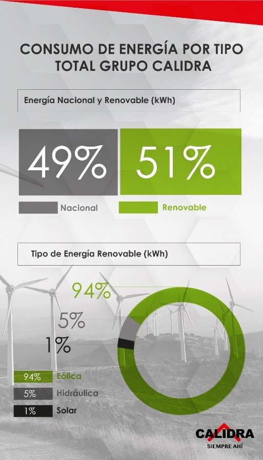 La producción de cal es un proceso intensivo en el ámbito del consumo de energía. Por esto, Grupo Calidra es abastecido en gran parte de sus operaciones con energía eléctrica, proveniente de fuentes renovables (eólica, hidráulica y solar). Desde 2022, la mitad de la energía que utiliza proviene de fuentes renovables.