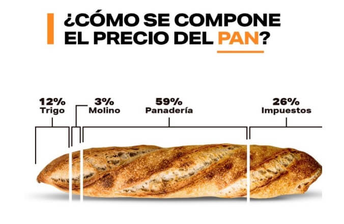 En el caso del pan, el trabajo de FADA permite visualizar que el mayor costo corresponde a la panadería, con un 59% de incidencia, seguido por impuestos (26%), trigo (12%) y el molino, con un 3%.
