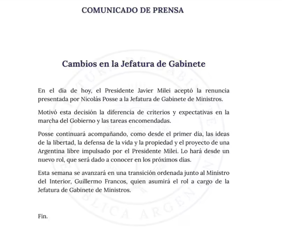 En otro comunicado difundido esta noche, el Gobierno dejó en claro los cuestionamientos severos a la gestión de Posse. “En el día de hoy, el presidente Javier Milei presentó la renuncia presentada por Nicolás Posse a la Jefatura de Gabinete de Ministros. Motivó esta decisión la diferencia de criterios y expectativas en la marcha del Gobierno y las tareas encomendadas. Posse continuará acompañando, como desde el primer día, las ideas de la libertad, la defensa de la vida y la propiedad y el proyecto de una Argentina libre, impulsado por el Presidente Milei. Lo hará desde un nuevo rol, que será dado a conocer en los próximos días. Esta semana se avanzará en una transición ordenada junto al Ministro del Interior, Guillermo Francos, quien asumirá el rol a cargo de la Jefatura de Gabinete de Ministros. Fin”.