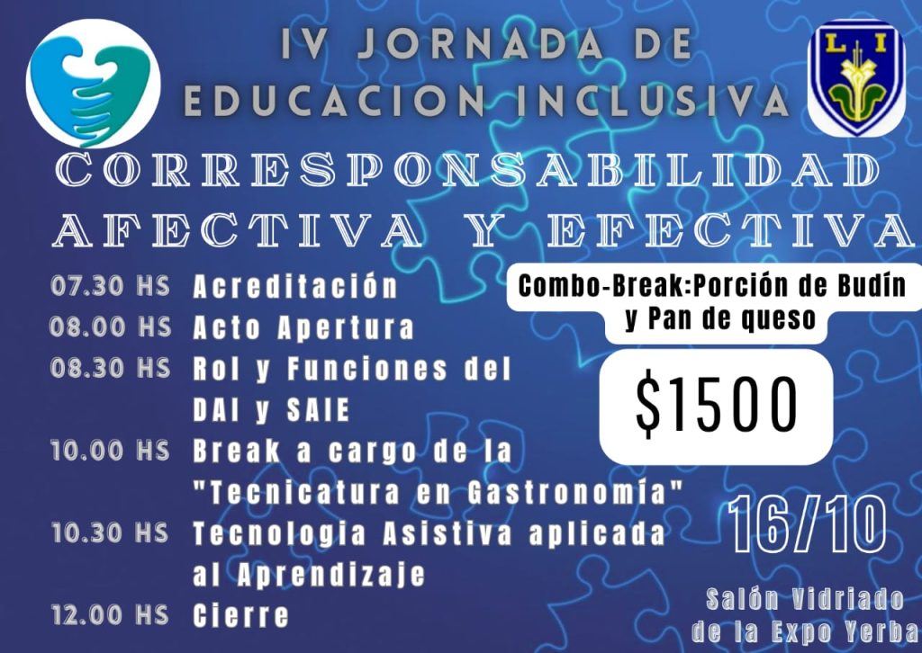 - “Jornada de Educación Inclusiva: Corresponsabilidad afectiva y efectiva” es el lema del evento de este año que pretende hacer su aporte a que la educación especial transversalice los diferentes niveles del sistema educativo para evitar la segregación y exclusión. Tiene como destinatarios a alumnos de profesorados, docentes y directivos de todos los niveles y padres que requieran obtener herramientas y orientaciones para la intervención cotidiana ante casos de Discapacidad Intelectual.