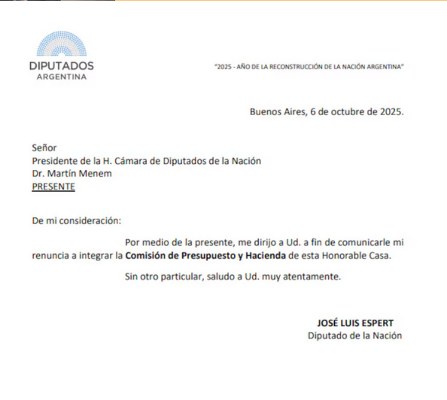 José Luis Espert renunció a la Comisión de Presupuesto y Hacienda de la Cámara de Diputados. La decisión fue oficializada esta mañana, a través de una nota presentada ante el presidente de la Cámara, Martín Menem.