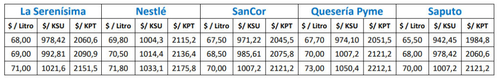 En la Cuenca Oeste de Bs. As., para una leche libre de Brucelosis y Tuberculosis, con 3.65 grasa y 3.30% proteína, 25.000 UFC, 300.000 CCS, y remitida a 4.0 ºC. Se trata de una estimación genérica y -como tal- sólo orientativa, referida a algunas de las principales empresas que operan en la Región. Se toma “anillo 2” de Planta Gral. Rodríguez de La Serenísima. La 1º fila, se refiere a un tambo de 2000 litros / día, la 2° corresponde a un tambo de 5000 litros / día, y la 3º hace referencia a un tambo de 10000 litros / día. Los precios se expresan en $/Litro, $/KSU (Kg de sólidos útiles), y $/KPT (Kg de proteínas totales).