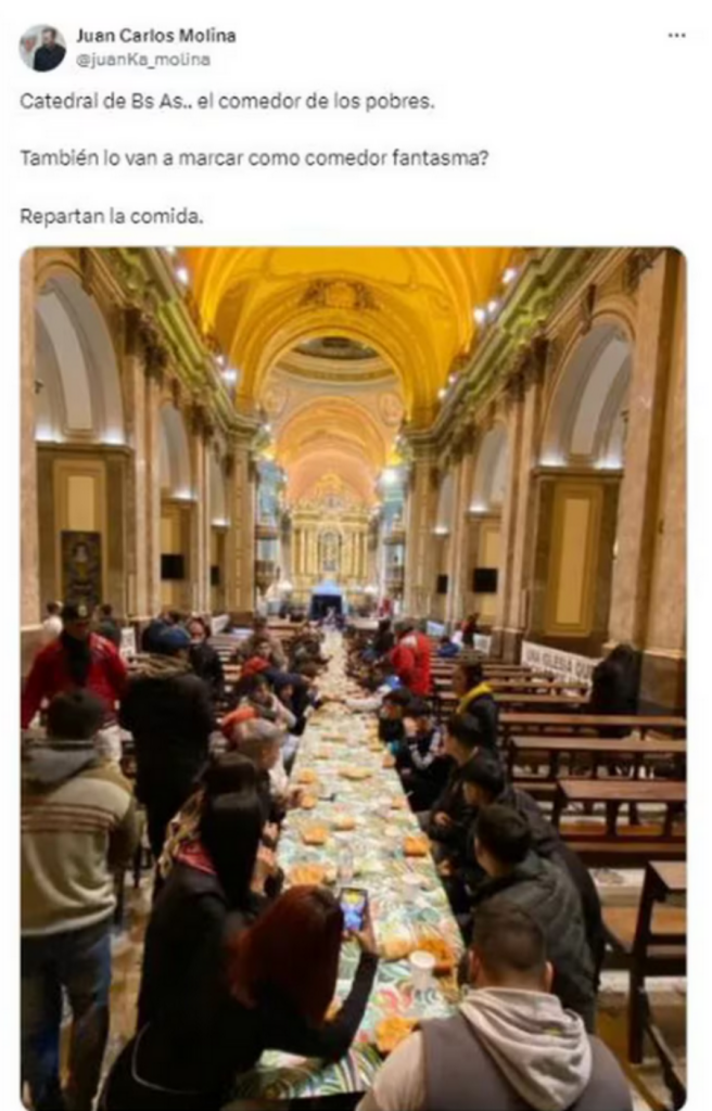 La aclaración ocurrió porque en las redes sociales se difundió la foto de la mesa como una movida de la Iglesia Católica para poner en superficie el drama del hambre. “Catedral de Bs As.. el comedor de los pobres. También lo van a marcar como comedor fantasma? Repartan la comida”, difundió en su cuenta de X Juan Carlos Molina, un cura que tiene comunicación directa con la ex vicepresidenta Cristina Kirchner. Ese comentario y otros similares de cuentas ligadas al kirchnerismo cayeron mal en la Curia, según reconoció en diálogo con Infobae una fuente eclesiástica.