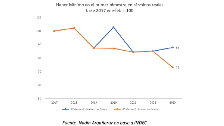 Con bonos, la situación refleja mejoras, obviamente, en los periodos en que se otorgaron. Es decir en 2020 y en este año 2023. En efecto, la caída del poder adquisitivo de un jubilado se reduce desde el 27% sin bonos al 12% con bonos, siempre comparando con 2017.