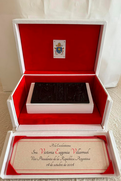 Victoria Villarruel le llevó al Papa la escultura de un caballo con su potrillo