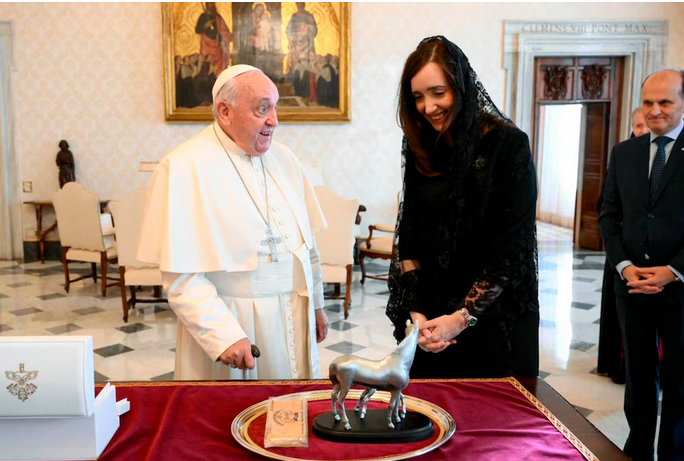 El encuentro tuvo lugar en la Biblioteca del Palacio Apostólico, donde el Sumo Pontífice recibe habitualmente a los Jefes de Estado. Todo se desarrolló en un clima muy amable, hasta cariñoso. La Vicepresidente de la Nación conocía a Jorge Bergoglio, de sus tiempos como Arzobispo de Buenos Aires, y luego lo había visto una vez, ya como Papa, en 2014. Lo vio bien de salud y Francisco estuvo incluso de pie buena parte del encuentro, como se aprecia en las fotografías.