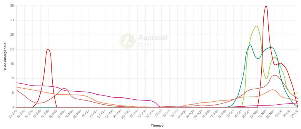 Las semillas de esta maleza que se encuentran en la superficie del suelo pueden romper su dormición con temperaturas entre 20 y 30 °C en presencia de luz, logrando germinar rápidamente. Tal como se observa en el gráfico de dinámica de emergencia de REM (Figura 2), las principales cohortes o camadas de emergencia se ven durante la primavera con un segundo pico durante los meses de Febrero y Marzo.