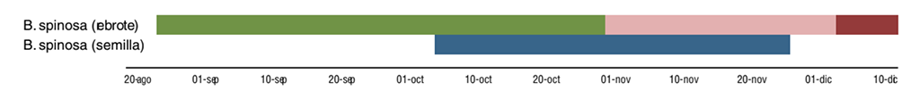 En la Figura 3 se puede ver como el rebrote a partir del xilopodio hacia fines de agosto y su posterior floración y reproducción se anticipa al nacimiento de plántulas a partir de semilla que ocurre desde principios de Octubre.
