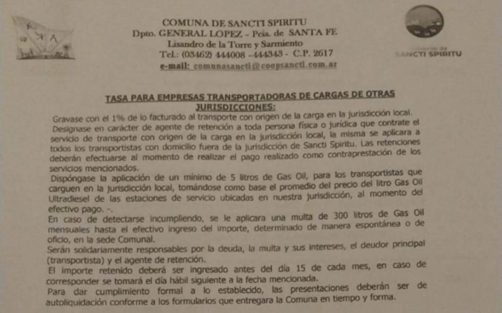 A su vez, por estos días también se debate una nueva carga impositiva muy cerca de la zona en cuestión, pero en suelo santafesino. Se trata del municipio de Sancti Spiritu, donde el intendente Cristian Vincenti propuso la creación de una tasa para las empresas de transporte de cargas.