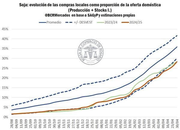 De acuerdo con la entidad rosarina, si bien la comercialización de soja en el mercado local se encuentra aún algo rezagada respecto al promedio de los últimos cinco años, las últimas semanas evidenciaron un fuerte repunte de los negocios.