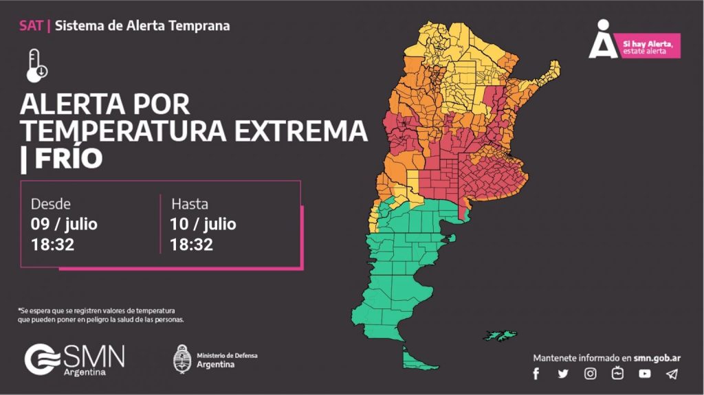 De esta manera, desde que arrancó la presente semana, todos los días el Servicio Meteorológico Nacional (SMN) ha estado emitiendo alertas de nivel rojo, naranja y amarillo por temperatura extrema vinculada al frío.