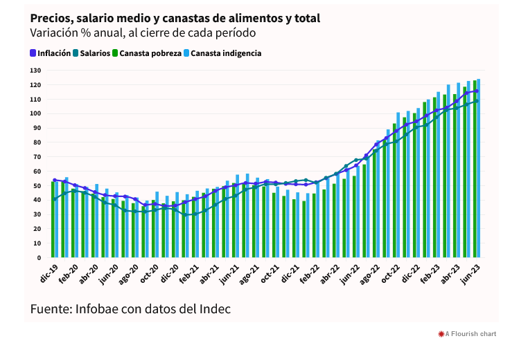 “Esto es un aumento interanual de 121.6%. Para el promedio del ingreso total familiar (ITF) se proyectó para el semestre un incremento interanual de 98.5%”, explicó. El Instituto Nacional de Estadística y Censos (Indec) informó que el índice de precios al consumidor (IPC) subió 12,4% en Agosto y 124,4% el último año. En particular, los alimentos treparon 15% el mes pasado y 133% en los últimos 12 meses. “Con estos datos y la simulación de los microdatos de la EPH del segundo y tercer trimestre de 2023 se proyectó la tasa de pobreza. El nowcast estima una tasa de pobreza de 43.2% para el semestre Mar23Ago23 con un intervalo del 95% de confianza entre [41.6%, 44.7%”, precisó el informe de la UTDT.