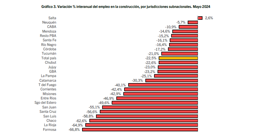 El informe revela que, en relación con los desempeños provinciales, continúa la tendencia generalizada a la baja. Evaluando la variación interanual, al igual que se vio en febrero, marzo y abril pasados, solamente la provincia de Salta presenta subas. En este caso, fue de 2,6%; por el contrario, las demás jurisdicciones subnacionales exhibieron bajas y de esas, solo Neuquén lo hizo a un dígito (-5,7%). En el otro extremo, hay seis provincias con caídas que superan el 50% interanual y tres de ellas caen incluso por encima del -60%.