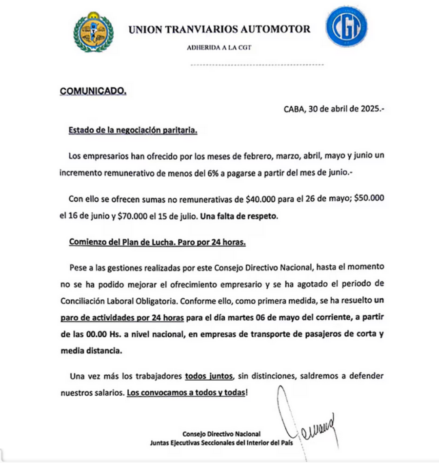 “Pese a las gestiones realizadas por este Consejo Directivo Nacional, hasta el momento no se ha podido mejorar el ofrecimiento empresarial y se ha agotado el periodo de Conciliación Laboral Obligatoria. Conforme ello, como primera medida, se ha resuelto un paro de actividades por 24 horas para el día martes 6 de Mayo del corriente, a partir de las 00,00 horas a nivel nacional, en empresas de transporte de pasajeros de corta y media distancia", anunció la UTA.