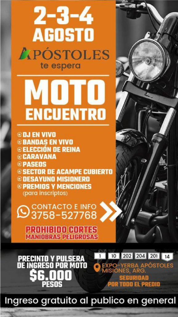 En conferencia de Prensa el referente del Moto Grupo Apóstoles Marcelo Pereyra comento “tenemos muchas expectativas, es el tercer año que el Moto Grupo se pone al frente de la organización con el acompañamiento del Municipio, es uno del los encuentros que mas moto atrae, significará un gran movimiento económico, entre las actividades esta confirmado la presencia de un D.J. durante toda la jornada, bandas en vivo viernes y sábado también la elección de reina, caravana, paseos turísticos, desayuno misionero, entrega de distinciones además de destacar que el acampe será cubierto, el ingreso al predio para los Motoqueros visitantes será de $6000, siendo libre y gratuita para el público en general, este año no habrá observaciones sobre las cilindradas de las motos, si se exigirá la documentación en regla”.