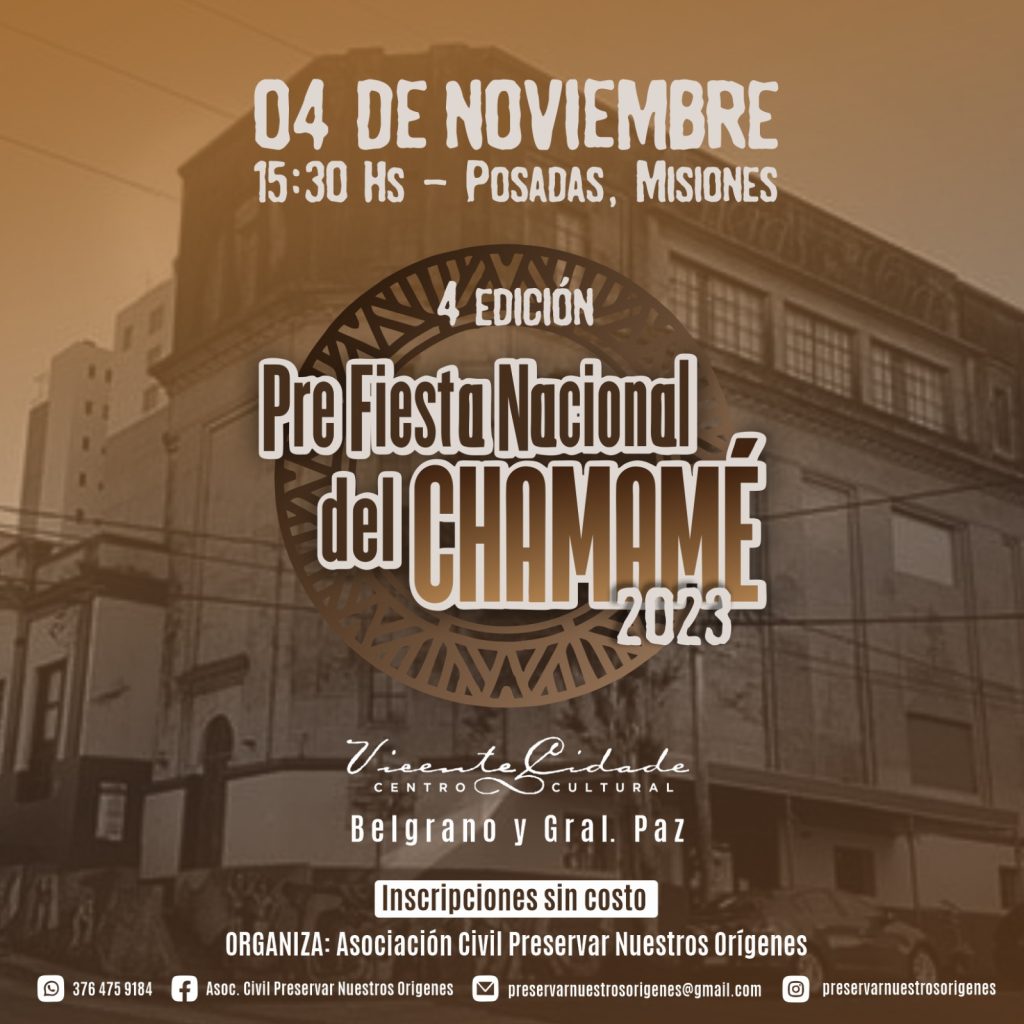 POSADAS. La Asociación Civil Preservar Nuestros Orígenes abrió las inscripciones para la Cuarta Edición de la Pre Fiesta Nacional del Chamamé de Corrientes que tendrá lugar el próximo 4 de Noviembre en el Centro Cultural Vicente Cidade (Belgrano y General Paz) de la Ciudad de Posadas.