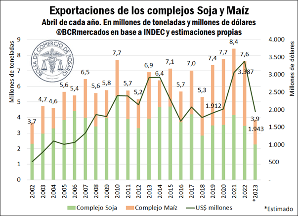 Aunque las cifras finales aún no se han publicado, en base a datos preliminares de embarques, la BCR estima que en abril se enviaron al exterior apenas 3,9 millones de toneladas, un 49% por debajo del año pasado y 38% menos que el promedio de los últimos cinco ejercicios.