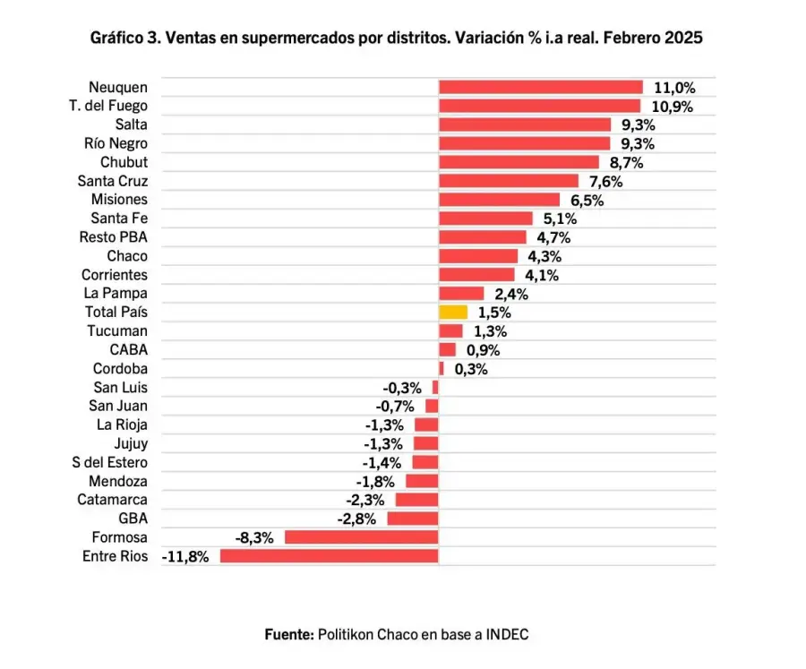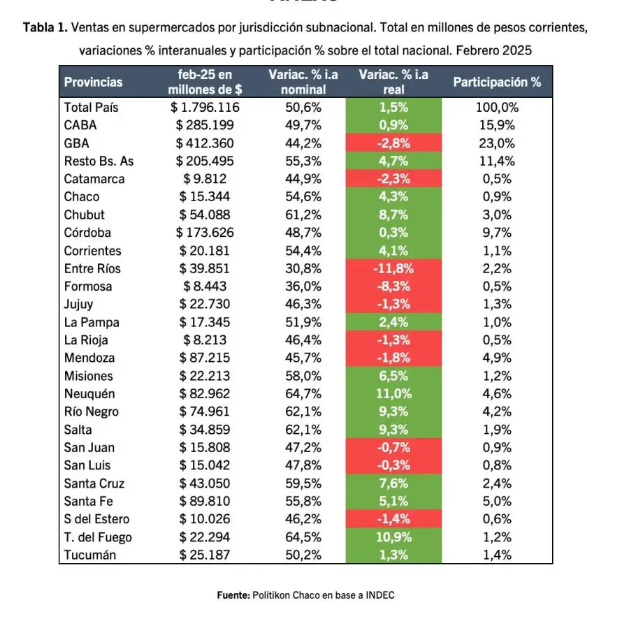 Las ventas en supermercados en la provincia de Misiones registraron una suba real del 6,5% interanual en febrero de 2025, según datos oficiales del INDEC procesados por la Consultora Politikon Chaco. Se trata de uno de los mejores desempeños del país, superando holgadamente la media nacional, que se ubicó en apenas 1,5%.