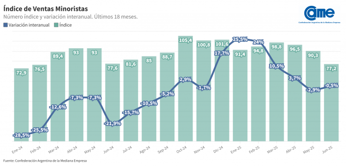 En el mes de Junio, las ventas minoristas de las Pequeñas y Medianas Empresas (PyMEs) tuvieron una caída interanual del 0,5% a precios constantes. En la comparación con el mes anterior también se verificó un descenso del 6,7%. No obstante, en el primer semestre del año las ventas acumulan un crecimiento interanual del 9,1%. Esto refleja cierta recuperación contra el descenso del 17,2% que habían experimentado durante el mismo período del año pasado.