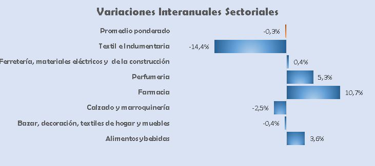 El ramo de mejor performance en el primer mes del año fue Farmacia, con un aumento real anual de 10,7%, seguido por Perfumerías (+5,3%) y por Alimentos y Bebidas (+3,6%). Por su parte, Textiles e indumentarias (-14,4%) y Calzado y marroquinería (-2,5%) fueron los de peor rendimiento.