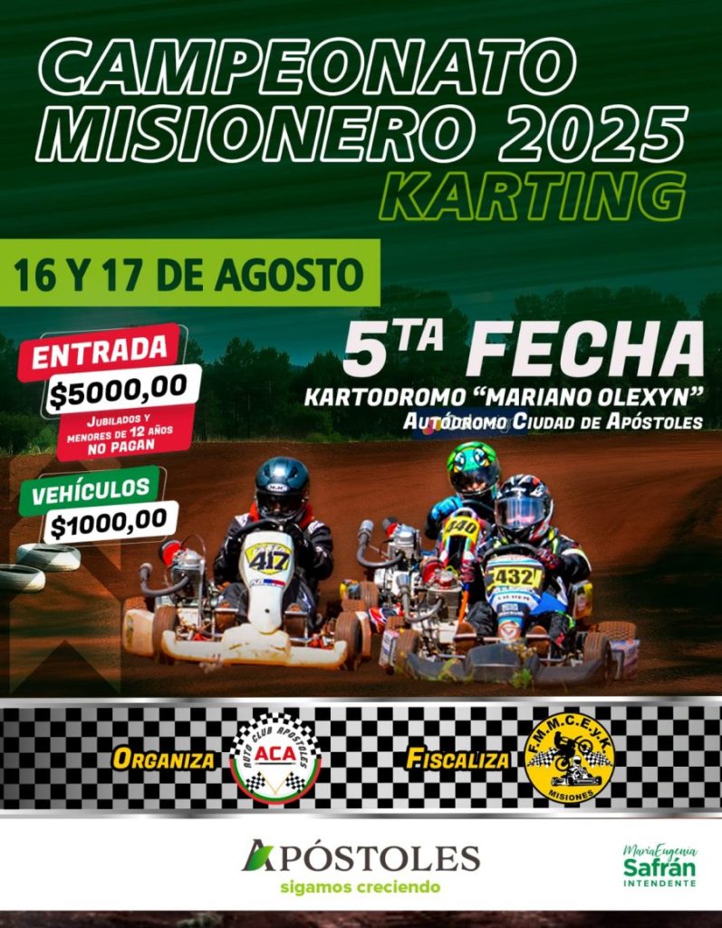 La Municipalidad de la ciudad misionera de Apóstoles juntamente con el Auto Club local y la Federación Misionera (FMMCEyK) invitan a la comunidad en general a presenciar la quinta Fecha del Campeonato Misionero de Karting en el Kartódromo terrado Mariano Olexyn, será los días; 16 y 17 de Agosto, esperándose la participación de más de 100 pilotos en todas las categorías y de toda la región.