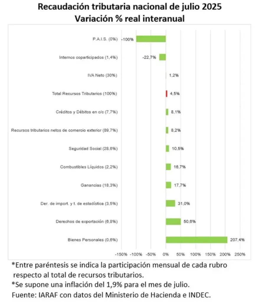 El Instituto Argentino de Análisis Fiscal (IARAF) estimó que la recaudación de julio habría subido 4,5%.