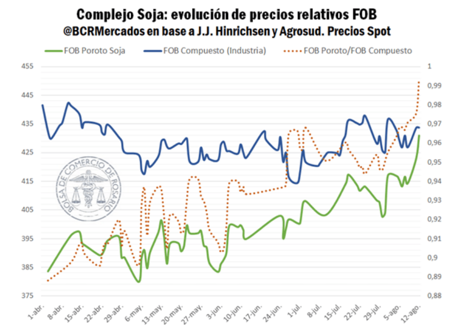 Bajo este panorama, debido a su naturaleza de producción complementaria, entre aceite, harina y cáscara de soja, la BCR hizo un promedio de precio FOB Compuesto para la industria, ponderando las cotizaciones de cada uno por su rendimiento en el proceso de extracción del poroto.