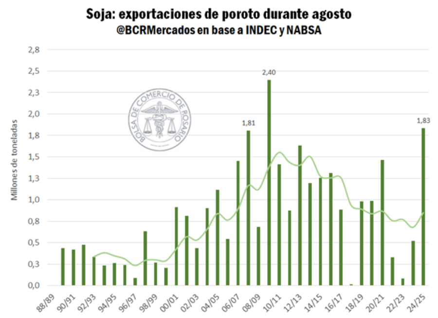 “Las exportaciones de poroto de soja vienen picando en punta”, resumió la BCR y puntualizó, por ejemplo, que las exportaciones se cuadruplicaron en julio, con respecto al mismo mes del año pasado.