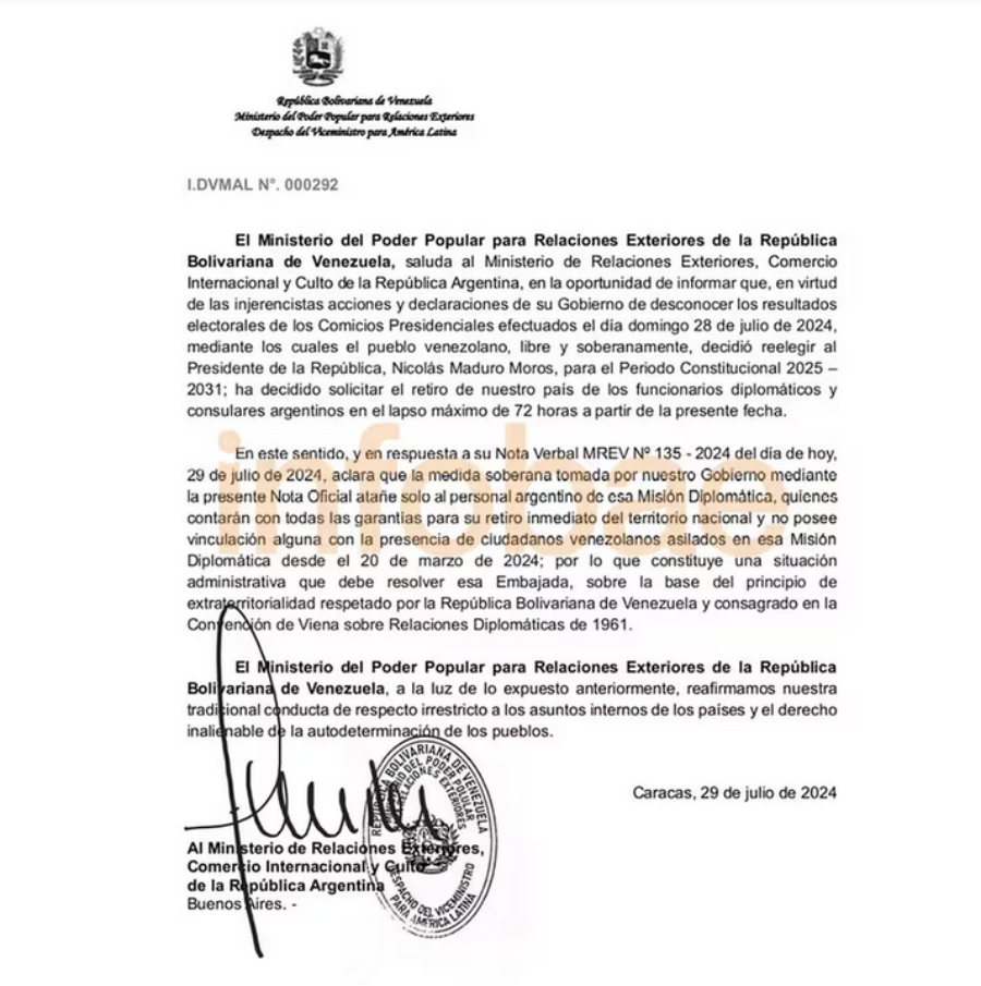 Los diplomáticos tuvieron que dejar el país porque el régimen dispuso la expulsión de todo el personal, lo que precipitó una ruptura de las relaciones diplomáticas. “En virtud de las injerencistas acciones y declaraciones de su gobierno de desconocer los resultados electorales de los comicios presidenciales efectuados el domingo (…) ha decidido solicitar el retiro de nuestro país de los funcionarios diplomáticos y consulares argentinos en el plazo máximo de 72 horas a partir de la presente fecha”, estableció la carta que entregó el régimen de Maduro.