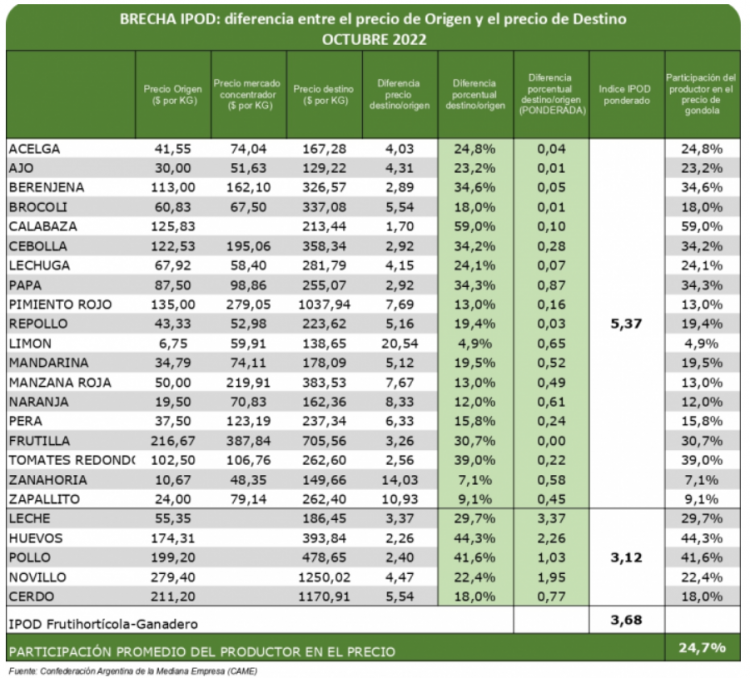 Un nuevo informe del Índice de Precios en Origen y Destino (IPOD) elaborado por el sector de Economías Regionales de la Confederación Argentina de la Mediana Empresa (CAME) reconfirmó la tendencia que se registra desde hace meses: sigue siendo muy baja la participación de los productores en el precio final de los agroalimentos.