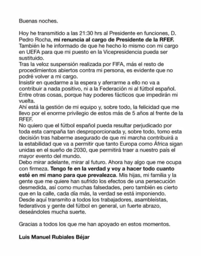 "Tras la veloz suspensión realizada por FIFA, más el resto de procedimientos abiertos contra mi persona, es evidente que no podré volver a mi cargo. Insistir en quedarme a la espera y aferrarme a ello no va a contribuir a nada positivo, ni a la Federación ni al fútbol español. Entre otras cosas, porque hay poderes fácticos que impedirán mi vuelta", dice el escrito.