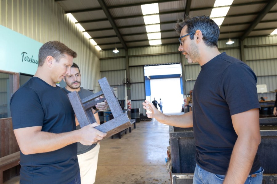 Otra de las plantas fabriles de las que se interiorizó el candidato fue la de la empresa Terekua, en Posadas, que produce muebles y otros elementos en madera plástica elaborada a partir de desechos, obteniendo productos de alta calidad.