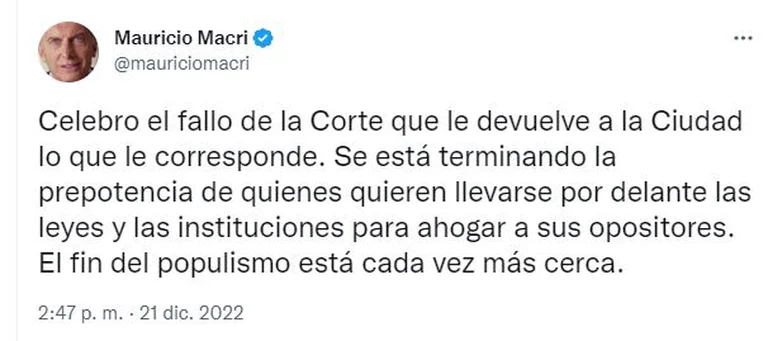 “Celebro el fallo de la Corte que le devuelve a la Ciudad lo que le corresponde”, apuntó Macri en el inicio de su mensaje publicado también a través de Twitter. A continuación, agregó: “Se está terminando la prepotencia de quienes quieren llevarse por delante las leyes y las instituciones para ahogar a sus opositores”.