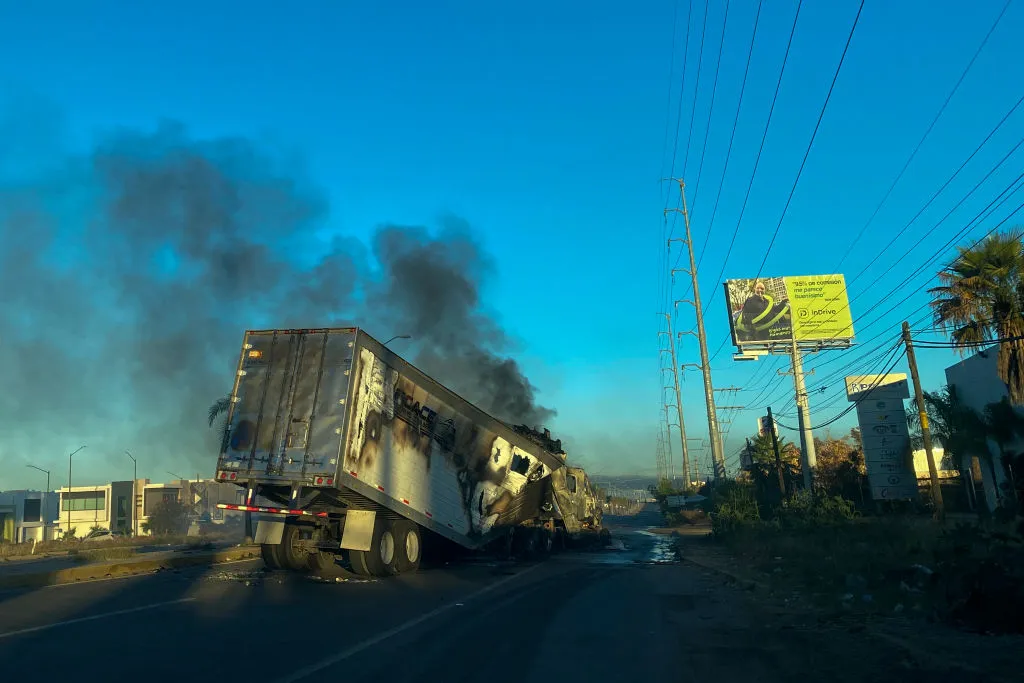 Un camión en llamas al otro lado de la calle durante una operación para arrestar al hijo de Joaquín "El Chapo" Guzmán, Ovidio Guzmán, en Culiacán, Sinaloa, México, el 5 de enero de 2023. (Foto de Marcos Vizcarra/AFP)