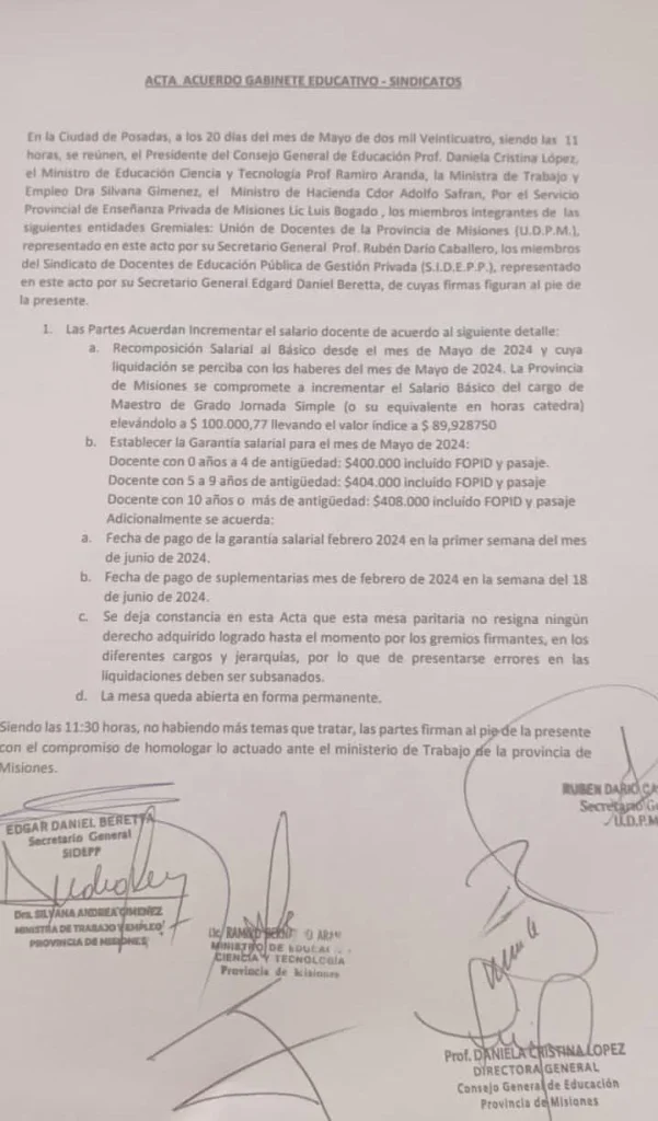 Tras negociaciones y un firme compromiso con la educación pública, la Mesa de Diálogo Docente de la provincia de Misiones ha alcanzado un acuerdo, con los gremios firmantes, en la mesa paritaria.