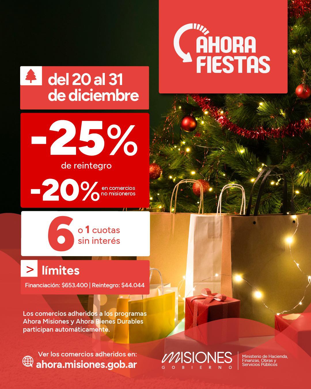 Con el objetivo de acompañar a las familias durante las compras de fin de año y potenciar el comercio la provincia de Misiones, el Programa Provincial Ahora Fiestas estará vigente desde el día sábado 20 de Diciembre y hasta el miércoles 31 de este mes.
