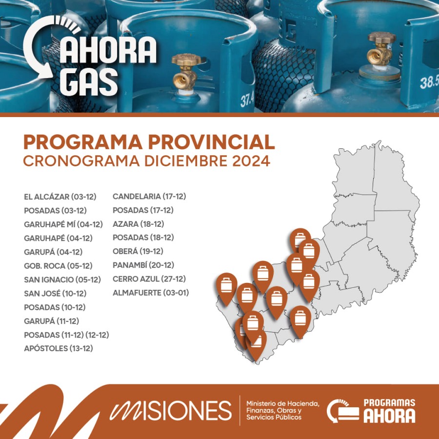 El Programa Provincial Ahora Gas continúa recorriendo semanalmente los distintos Municipios de la provincia de Misiones con operativos que permiten realizar recargas de garrafas de GLP de 10 kilos por un valor de 7.500 pesos, un precio bonificado muy inferior al valor en estaciones de servicio, comercios y cooperativas.