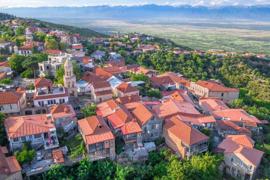 Aerial view of Sighnaghi, a picturesque town nested in Caucasus mountains, overlooking the vast Alazani Valley, in Kakheti region of Georgia.