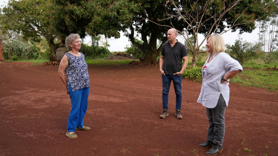 La Intendente de la ciudad misionera de Apóstoles, María Eugenia Safran y el Secretario de Obras Públicas Juan Pablo Cazut realizaron una recorrida por la colonia, visitando a vecinos productores y escuchando sus testimonios, en el marco de los trabajos de mantenimiento y arreglos de calles que conectan el sector rural con el casco urbano.