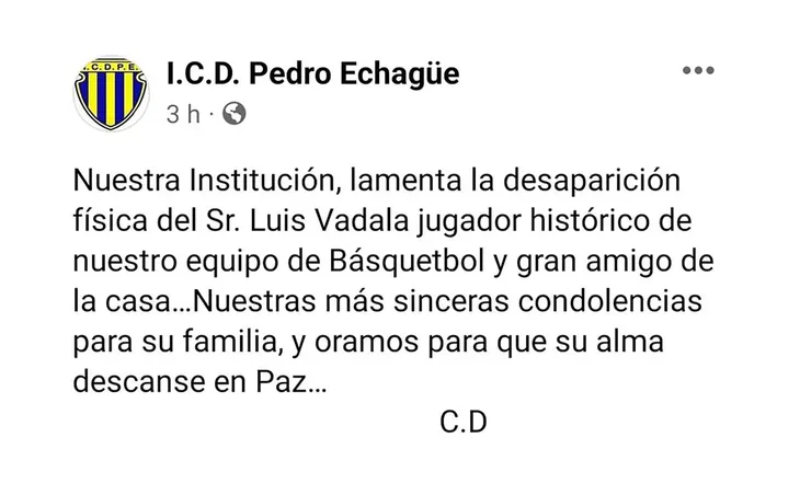 El club porteño I.C.D. Pedro Echagüe, del que era habitué, lo despidió mediante un tuit que señalaba: “Nuestra institución lamenta la desaparición física del SR. Luis Vadalá, jugador histórico de nuestro equipo de Basquetbol y gran amigo de la casa…Nuestras más sinceras condolencias para su familia y oramos para que su alma descanse en Paz”.