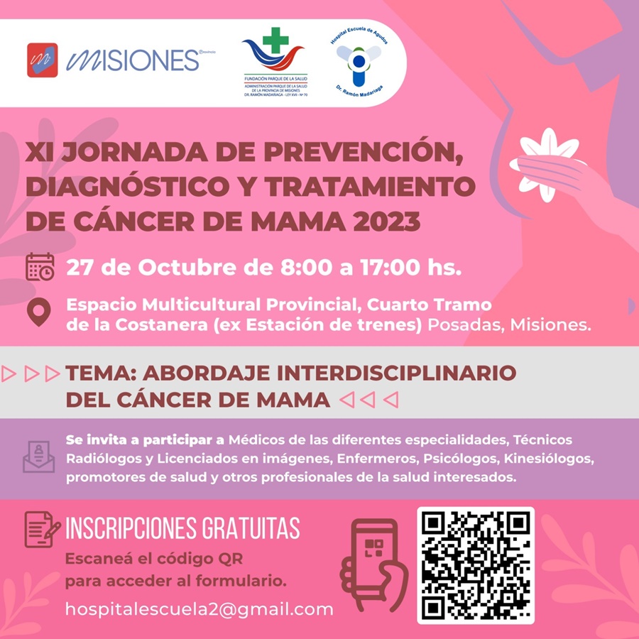 La XI Jornada de Prevención, Diagnóstico y Tratamiento de Cáncer de Mama 2023 tiene como tema principal el abordaje interdisciplinario del cáncer de mama. Se invita a participar a médicos de las diferentes especialidades, técnicos radiólogos y licenciados en imágenes; enfermeras, psicólogos, kinesiólogos, promotores de salud y otros profesionales de la salud interesados. El evento se llevará a cabo el día 27 de octubre de 8:00 a 17:00 hs. en el Espacio Multicultural Provincial (ex Estación de trenes) en la costanera de Posadas. Para más información e inscripciones: hospitalescuela2@gmail.com.