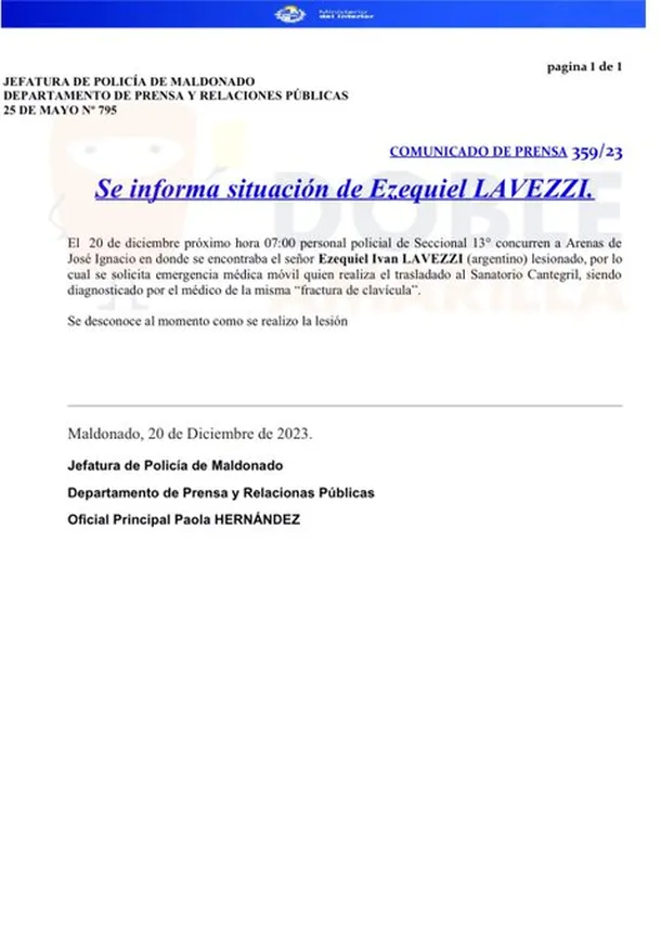 La Jefatura de Policía de Maldonado dio a conocer el parte médico oficial del Pocho Lavezzi y aseguró que el exfutbolista sufrió una "fractura de clavícula" y por esta razón fue ingresado al Santorio Cantegril.