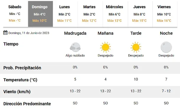 El martes las condiciones serán similares: cielo despejado por la mañana y algo nublado hacia la tarde/noche, con una temperatura mínima de 2 grados y una máxima de 12.