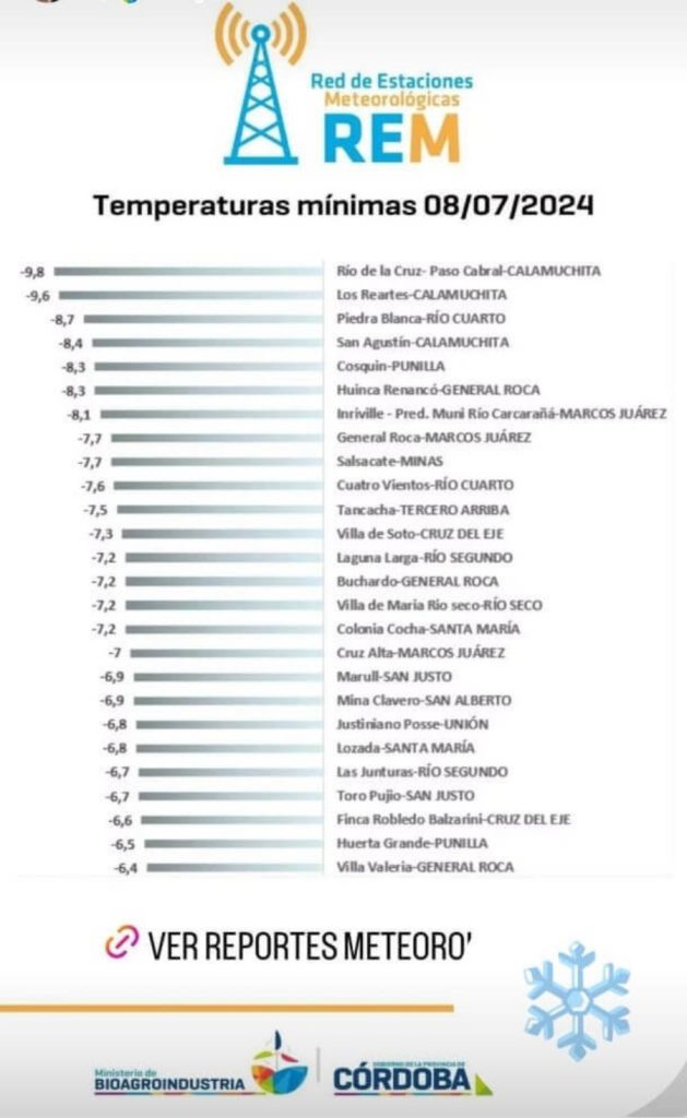En este marco, por ejemplo, desde el Ministerio de Bioagroindustria de Córdoba difundieron una placa que muestra que, en esa provincia, la mínima llegó incluso a rozar los -10°C.