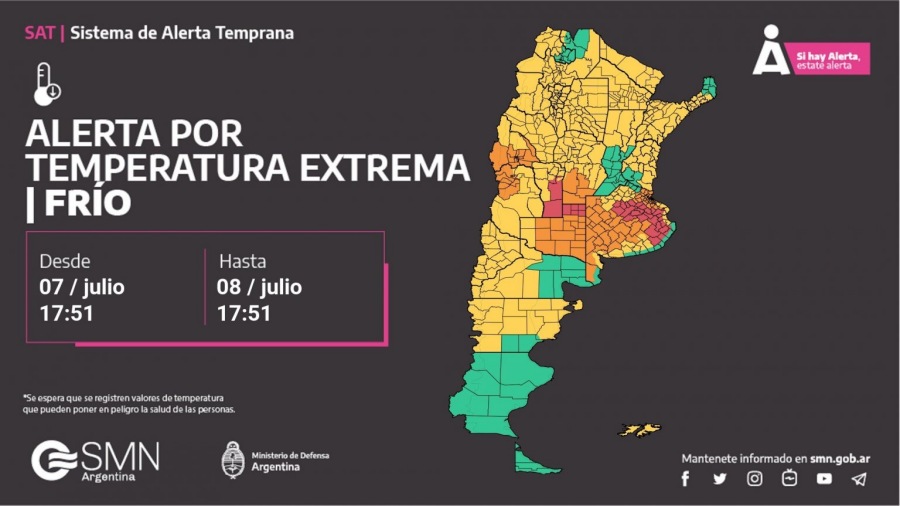 El Sistema de Alerta Temprana (SAT) del Servicio Meteorológico Nacional (SMN) inició la semana con un mapa que realmente sorprende por la dimensión de la ola polar que está afectando a la Argentina.