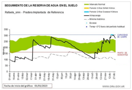 Para ejemplificar cómo la presente campaña transita por la buena senda, la ORA elaboró un gráfico de evolución de las reservas de agua en el suelo para la localidad Rafaela, como representativa de la situación en la delegación del mismo nombre.
