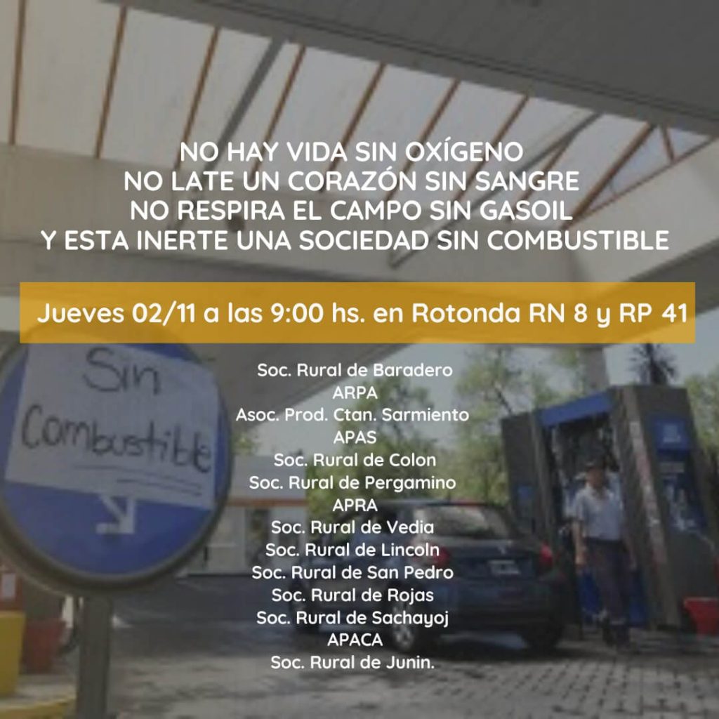 Ante el escenario de falta de gasoil, un grupo de sociedades rurales del norte bonaerense y una entidad de Santiago del Estero convocaron a una jornada de protesta, que se llevará a cabo el jueves 2 de Noviembre, en el cruce de las rutas 8 y 41, en la localidad de San Antonio de Areco - provincia de Buenos Aires.